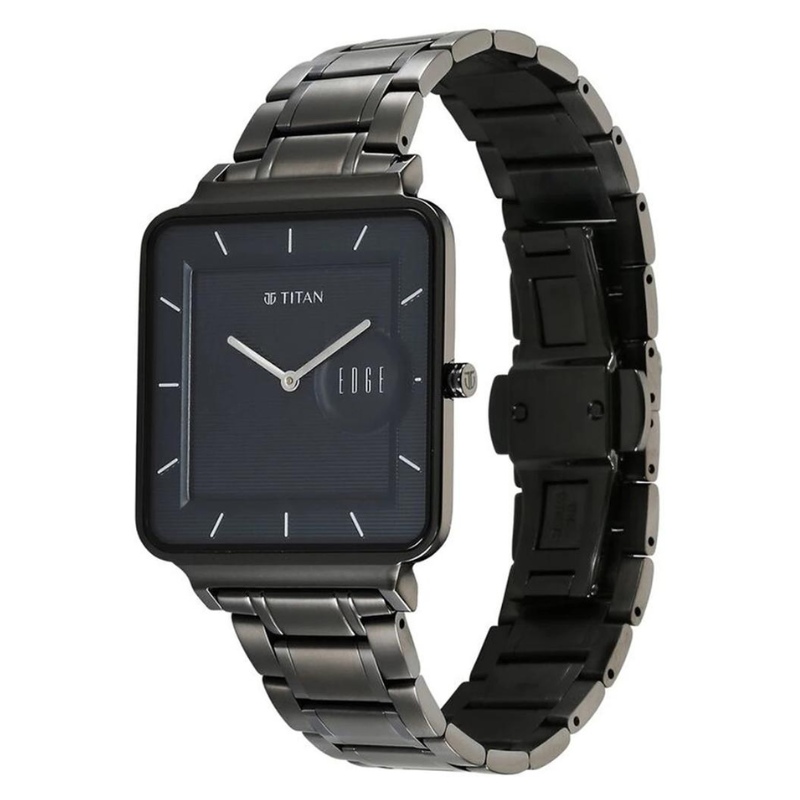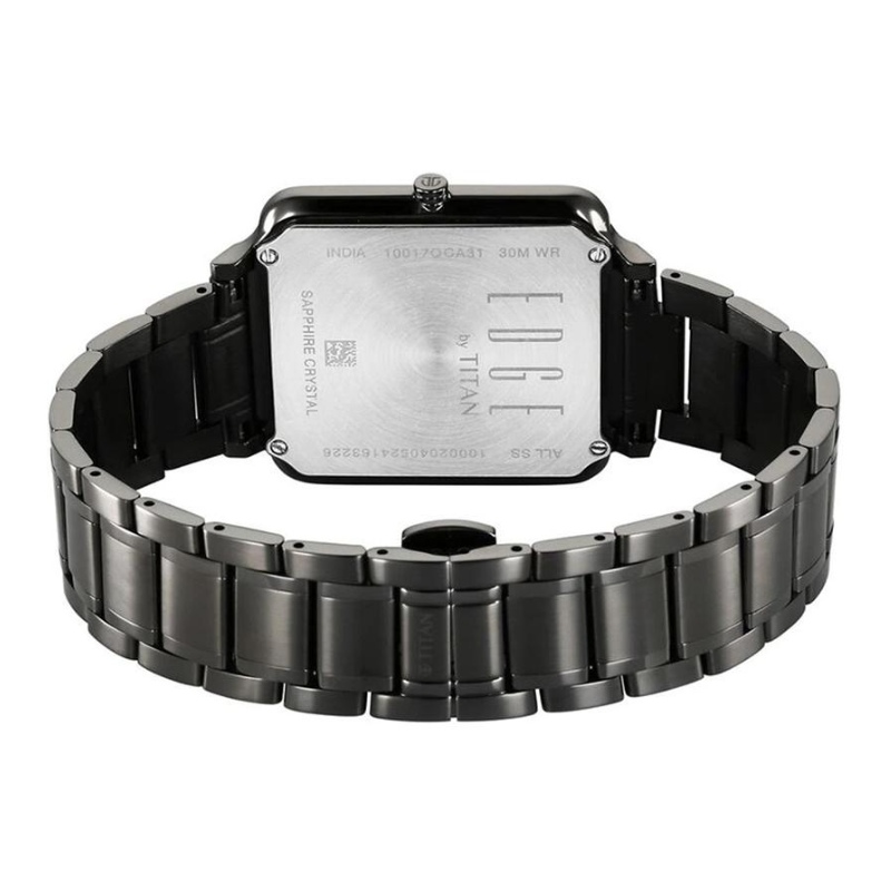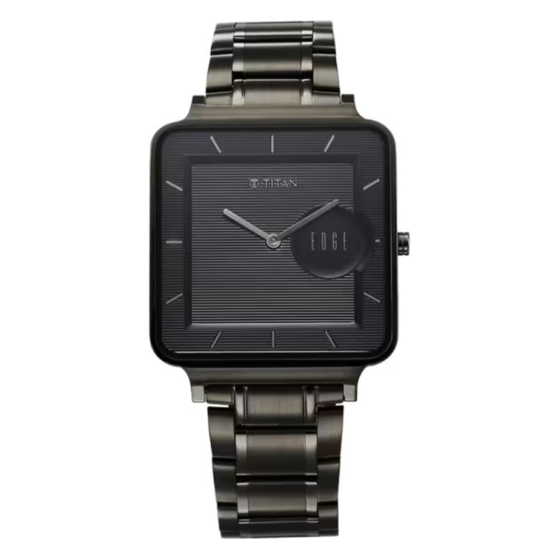 Titan Edge collection-renowned for being one of the slimmest watches in the world. Crafted with a sleek anthracite stainless steel strap, the watch merges luxury with contemporary aesthetics, making it an exceptional choice for formal and high-fashion looks.