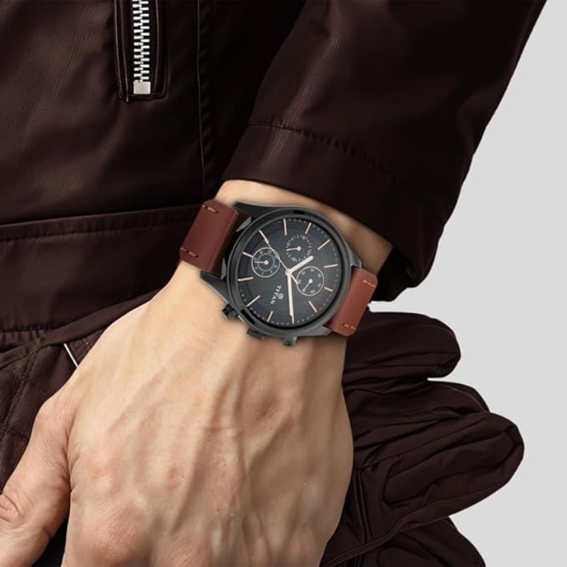 Adorn your wrist with the powerful allure of this timepiece featuring a bold black dial and a fine brown leather strap. The amalgamation of class and elegance is evident in the Multifunction dial with a date, day, and 24-hour clock, complemented by rose gold indices. Embrace the natural look effortlessly by pairing it with your workplace attire for a touch of sophistication.