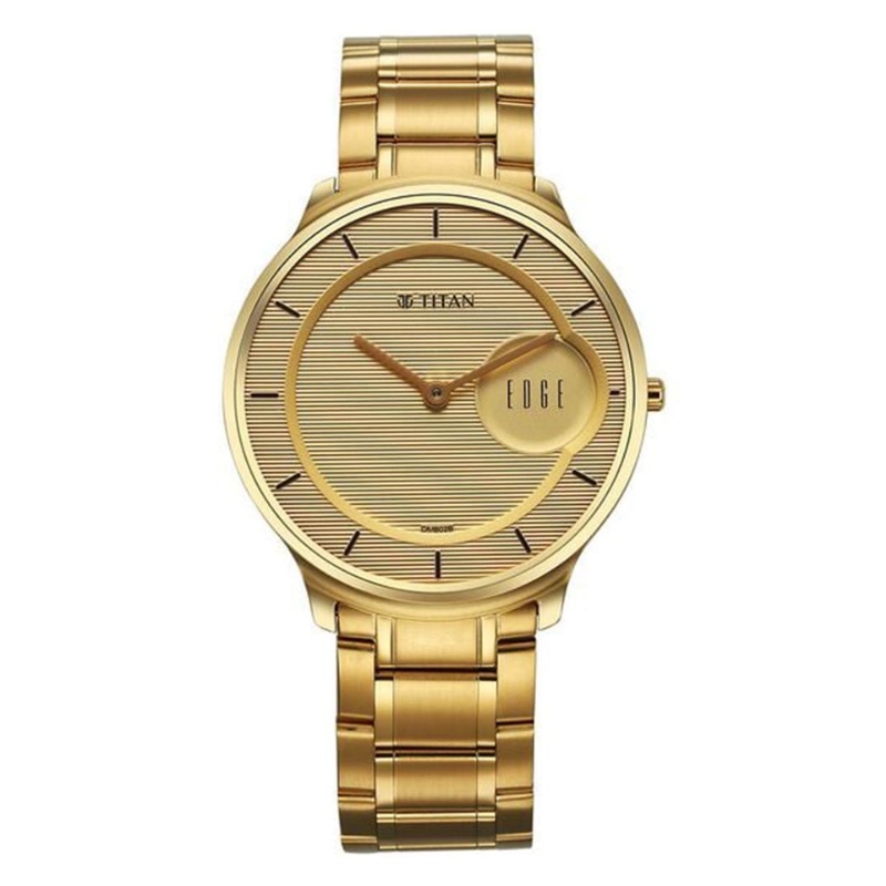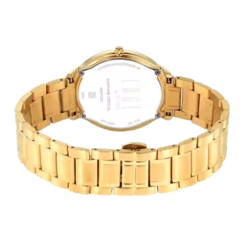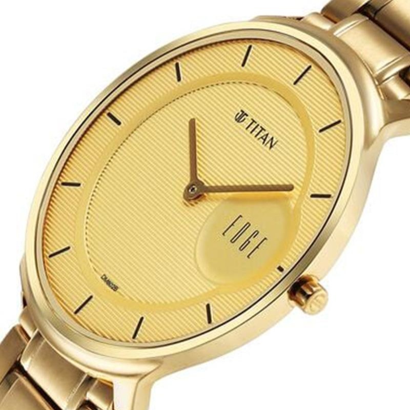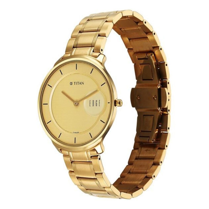 A symbol of sophistication and ultra-slim precision, this timepiece embodies timeless luxury. The radiant golden dial is elegantly minimalist, set in a sleek, ultra-thin case that defines the Titan Edge legacy. Complemented by a matching gold stainless steel strap, it delivers a monochrome look that speaks of subtle power and refined taste. Perfect for formal occasions and elevated everyday style, this piece is crafted for the modern gentleman who values grace in every detail.