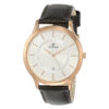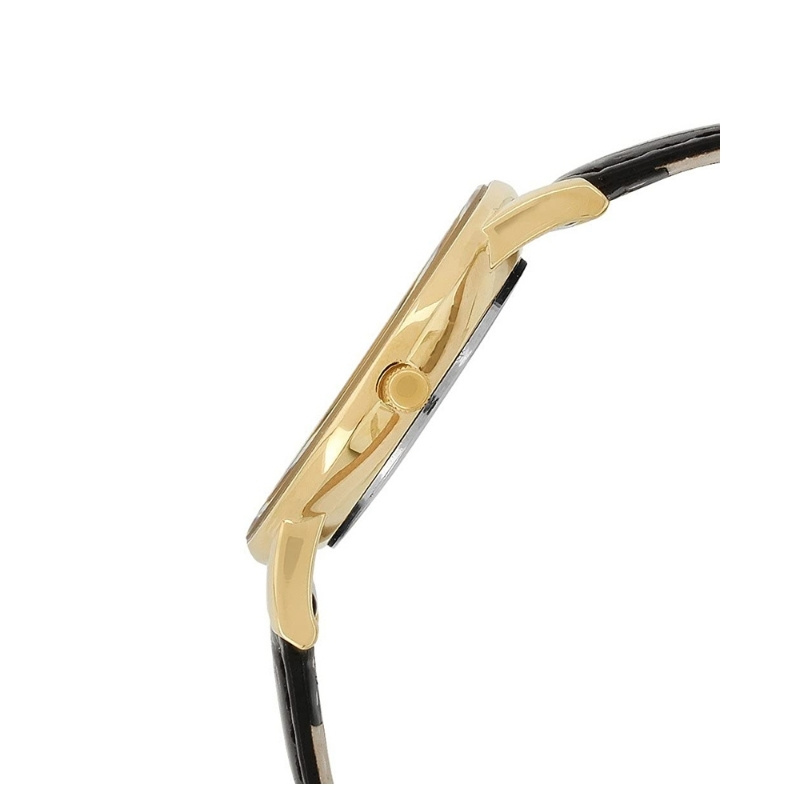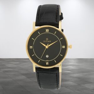 This analog watch for men features a round, black dial, housed in a brass case fitted with a crown. On the dial, plain three hands are present, along with Roman numeral markings at regular intervals and a date window at the sixth hour mark. The strap, made of black leather, comes with an adjustable metal buckle closure. Equipped with 3 ATM water-resistant depth, this watch is user-friendly.