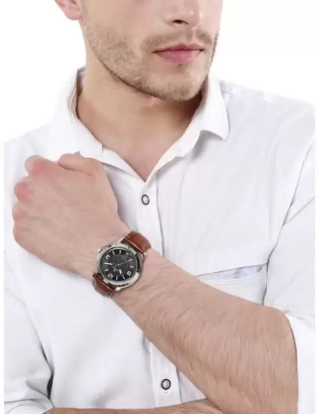 This analog men’s watch for men has a round, silver dial. Enclosed in a silver-coloured case with a crown, the dial features plain three hands, slanted markings at five minute intervals and a day and date display at the third-hour interval. Equipped with 3 ATM water-resistant depth, the timepiece is user-friendly. It comes with a 12-month warranty.