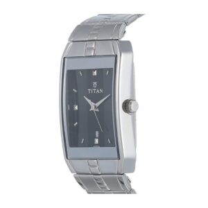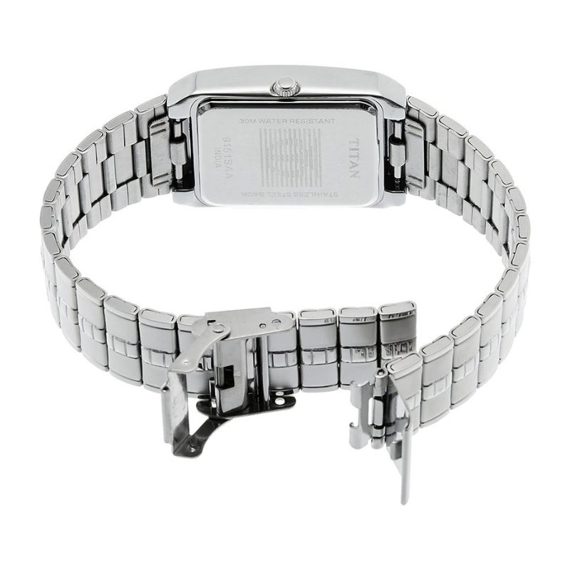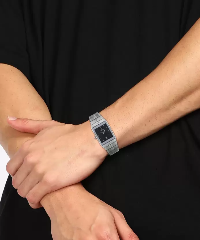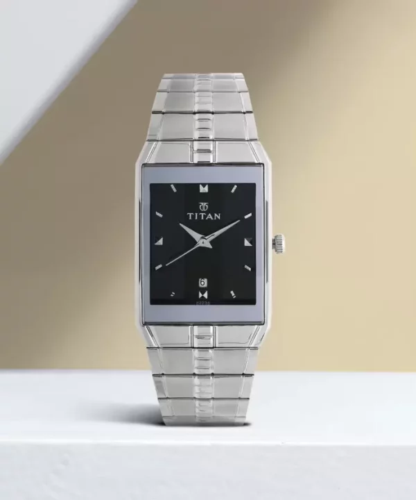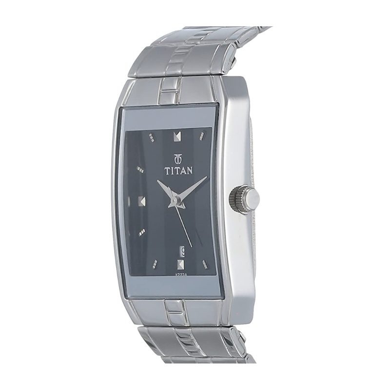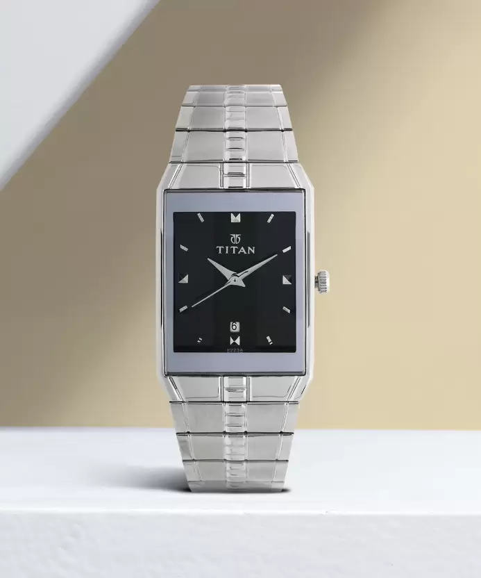 This analog watch for men features a Silver, rectangular dial, housed within a case that lets you adjust the time. The dial features plain three hands, slanted markings at five minute intervals, studded markings at quarter intervals and a date display.