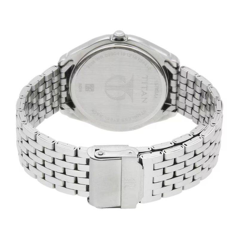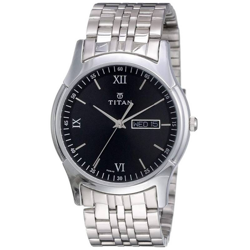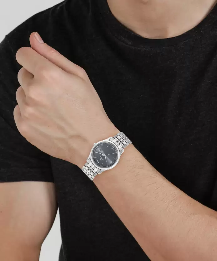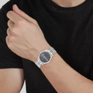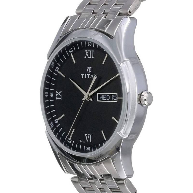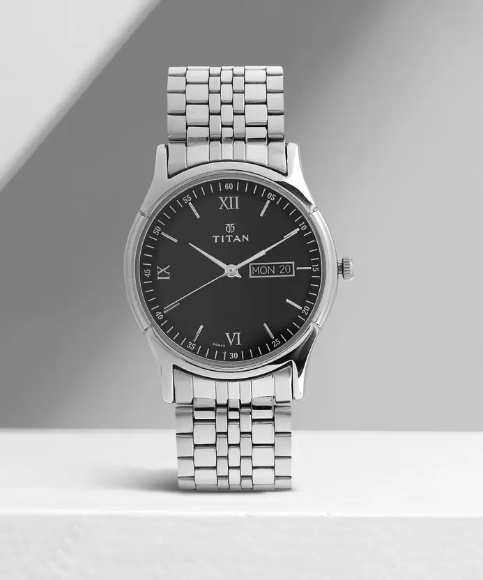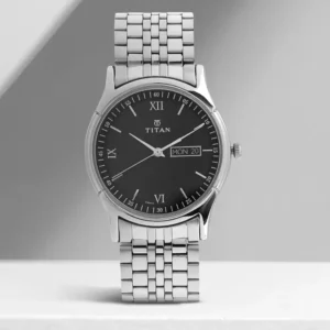 Presented in a stylish design, this men’s analog watch from Stylish’s Karishma Collection will be a great addition to your watch Collection. Safeguarded by a mineral glass, the black round dial housed in a 37mm case displays plain three hands, a date and day display window, numeral markings at five-minute intervals and Roman and stick markings. The silver metal strap is fitted with a hook buckle clasp to ensure a proper fit on the wrist.