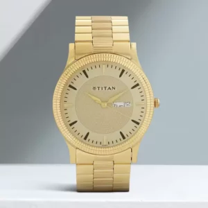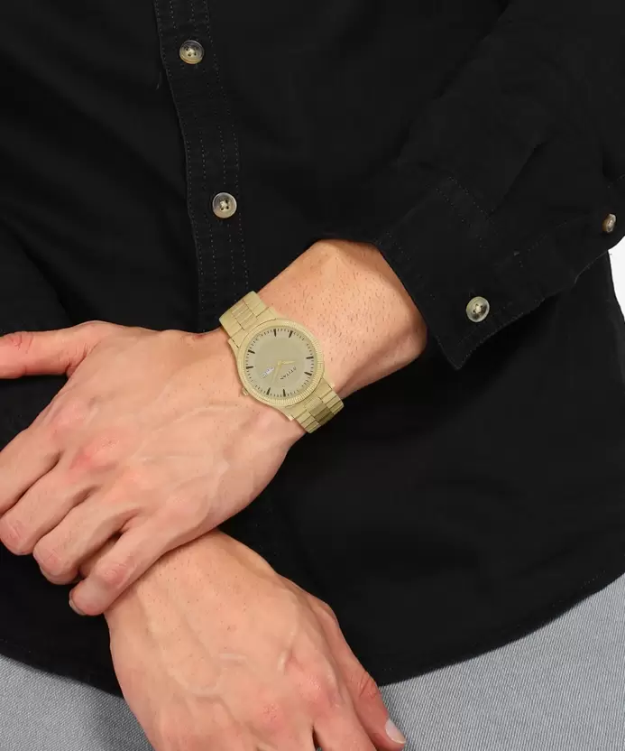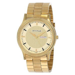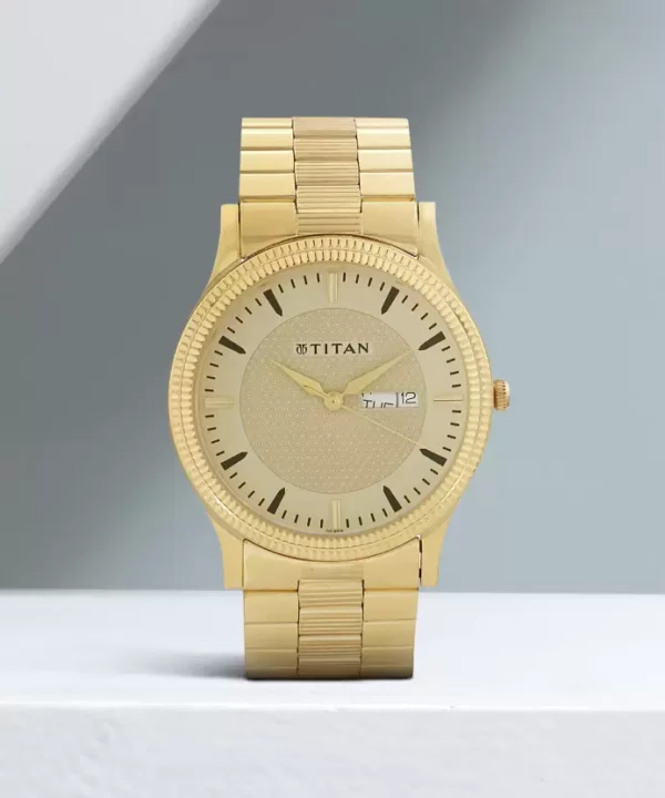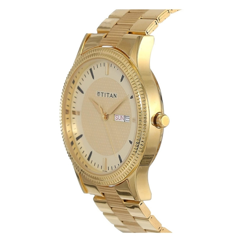 This analog watch for men features a patterned, round champagne dial, housed within a brass case. The dial has a day and date near the three o’clock position and slanted markings at the five minute intervals. It also has three plain hands. Made of metal, its gold strap is secured by a sliding clasp.