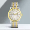 This analog watch for men features a round, silver-white dial that has three plain hands, slanted markings at the five minute intervals and a day and date display at the 3rd hour interval. A crown on the gold case lets you adjust the time. Its stainless steel, gold strap is fitted with a push-button clasp.This analog watch for men features a round, silver-white dial that has three plain hands, slanted markings at the five minute intervals and a day and date display at the 3rd hour interval. A crown on the gold case lets you adjust the time. Its stainless steel, gold strap is fitted with a push button clasp.
