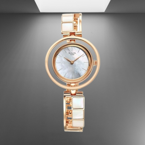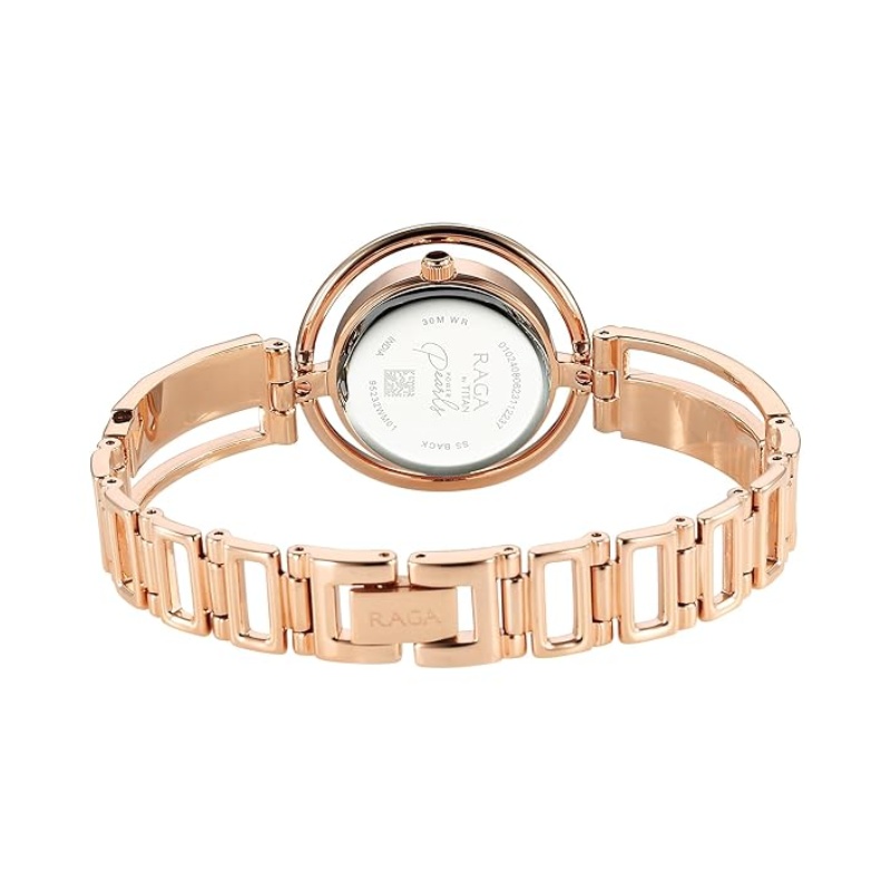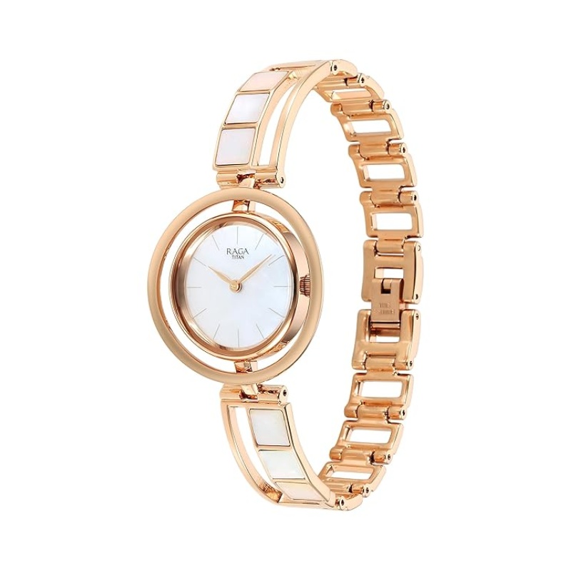 Wrap your wrist in shades of Rose Gold Featured in Titan Raga Viva collection and encased in a round metal case is this rose Multicolor dial analog watch, a subtle combination of classic style and trendy colours. The lovely dial is paired beautifully with the Rose Gold metallic strap. The watch shows the time with metal applique indices placed at five-minute intervals and three plain hands. Designed ergonomically, the strap of the watch amazingly serves as a stylish and fitting bracelet having jewellary clasp for the pleasing fit.