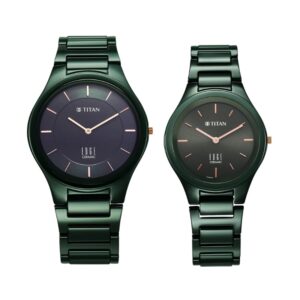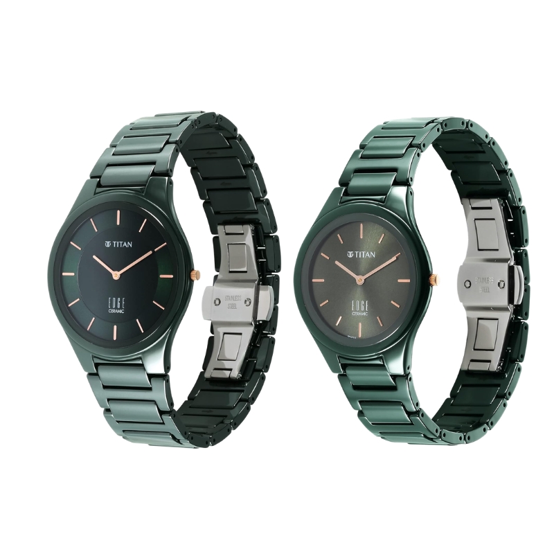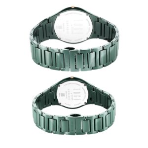 - A sophisticated watch set designed for couples, embodying elegance and precision. Both the watches in the pair feature the T9081 in-house caliber movement, ensuring reliable timekeeping. The watch is crafted with high-grade ceramic material, known for its durability and smooth finish, giving it a polished and refined look suitable for both formal and casual wear. The design focuses on a sleek, minimalist aesthetic, characterized by its green dial which pairs well with the ceramic strap, offering a cohesive and modern appearance. The ceramic strap is both lightweight and comfortable, making it ideal for all-day wear. The case is designed to be slim at 4.4 mm, emphasizing the sleekness of the watch without compromising on durability. The watch face is protected by a scratch-resistant sapphire crystal glass, which provides clarity and strength. The black dial is enhanced with simple, elegant hands,This watch set is perfect for couples seeking a matching accessory that balances style and performance. It is a versatile and timeless addition to any wardrobe.