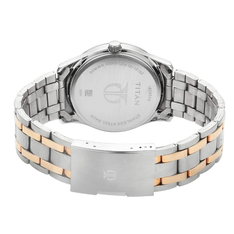 A classy timepiece with bold elegance that is what defines this timeless analog piece from Karishma collection. Housed carefully in a round metal case, is the silver dial with two toned stainless steel strap having Z clasp lock mechanism for the perfect fitting. What’s wonderful is its 3 ATM water resistance and the mineral glass which makes it scratchproof, making it an ideal timepiece for all events and occassions. The ideal blend of style and value, it feature day and date on the dial, keeping you precisely on time everytime.