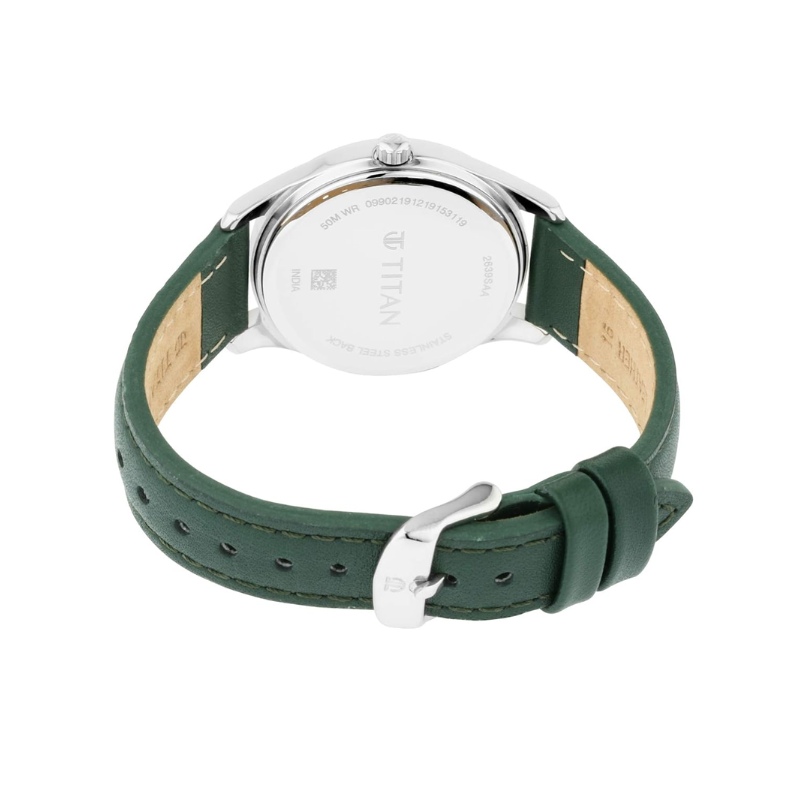 Embrace sophistication with this timepiece featuring a white circular dial indices for an elevated finish.The Green leather strap ensures all-day comfort