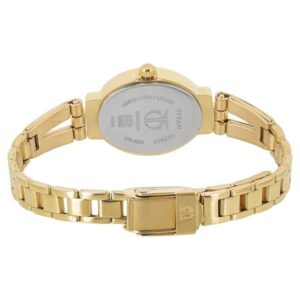 Keeping every head turn towards it is this glittering piece of art from the Titan Karishma collection. The watch, with a gloss finished case, has a specially shaped dial in champagne colour. It has a unique de-plated design which follows the shape of the dial. The dial also features a studded crystal for the 12-hour mark and gold-coloured dot metal indices for the other marks. The golden colour half kada stainless steel strap completes the style features of this exquisite watch from Titan.