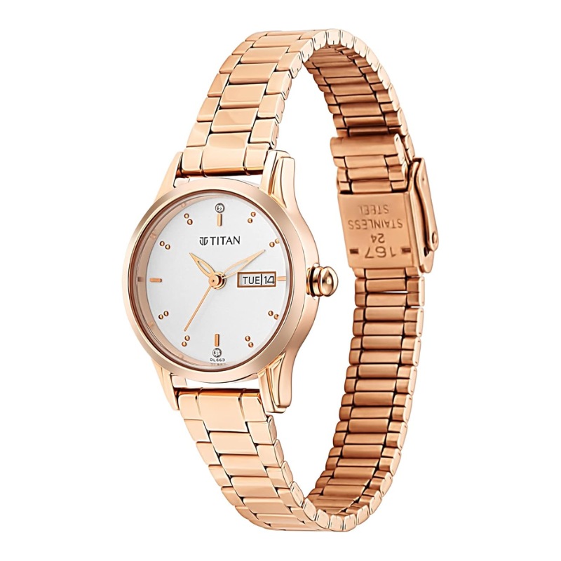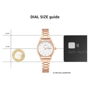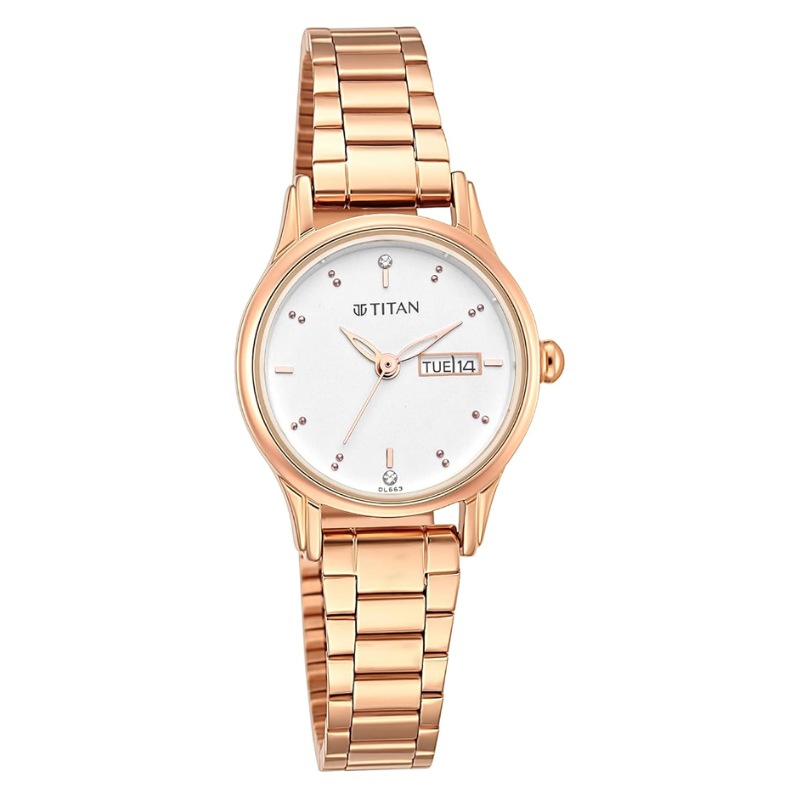 Achieve timeless elegance with this watch featuring a clean white dial, dotted gold indices, and skeletal hands. The sliding clasp ensures ultimate comfort, while stone detailing and a rose gold dial add a touch of sophistication. Perfect for both casual and dressy occasions, pair it with a floral sundress or an elegant evening gown.