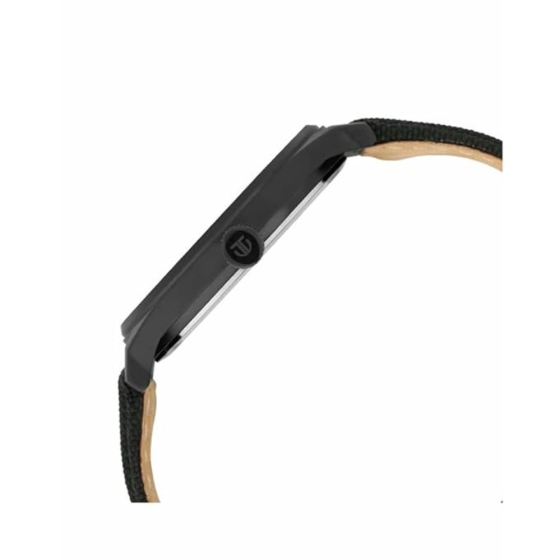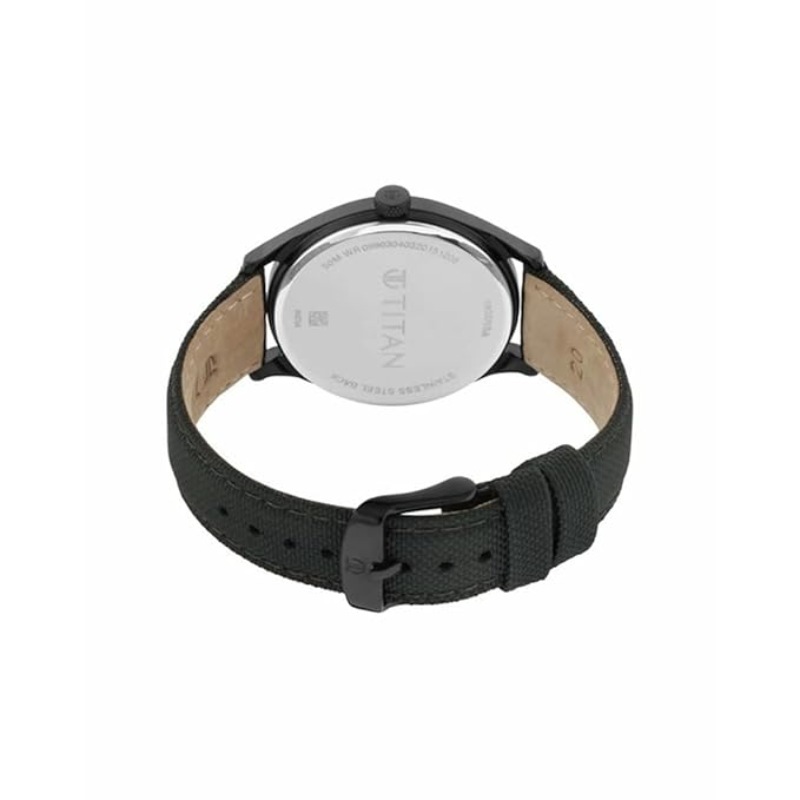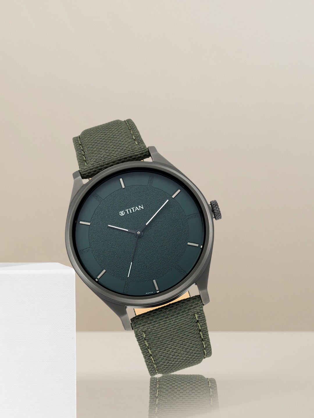 This analog watch for men features a round, black dial, housed in a brass case fitted with a crown. On the dial, plain three hands are present, along with Roman numeral markings and The strap, made of Green leather, comes with an adjustable metal buckle closure. Equipped with 3 ATM water-resistant depth, this watch is user-friendly.